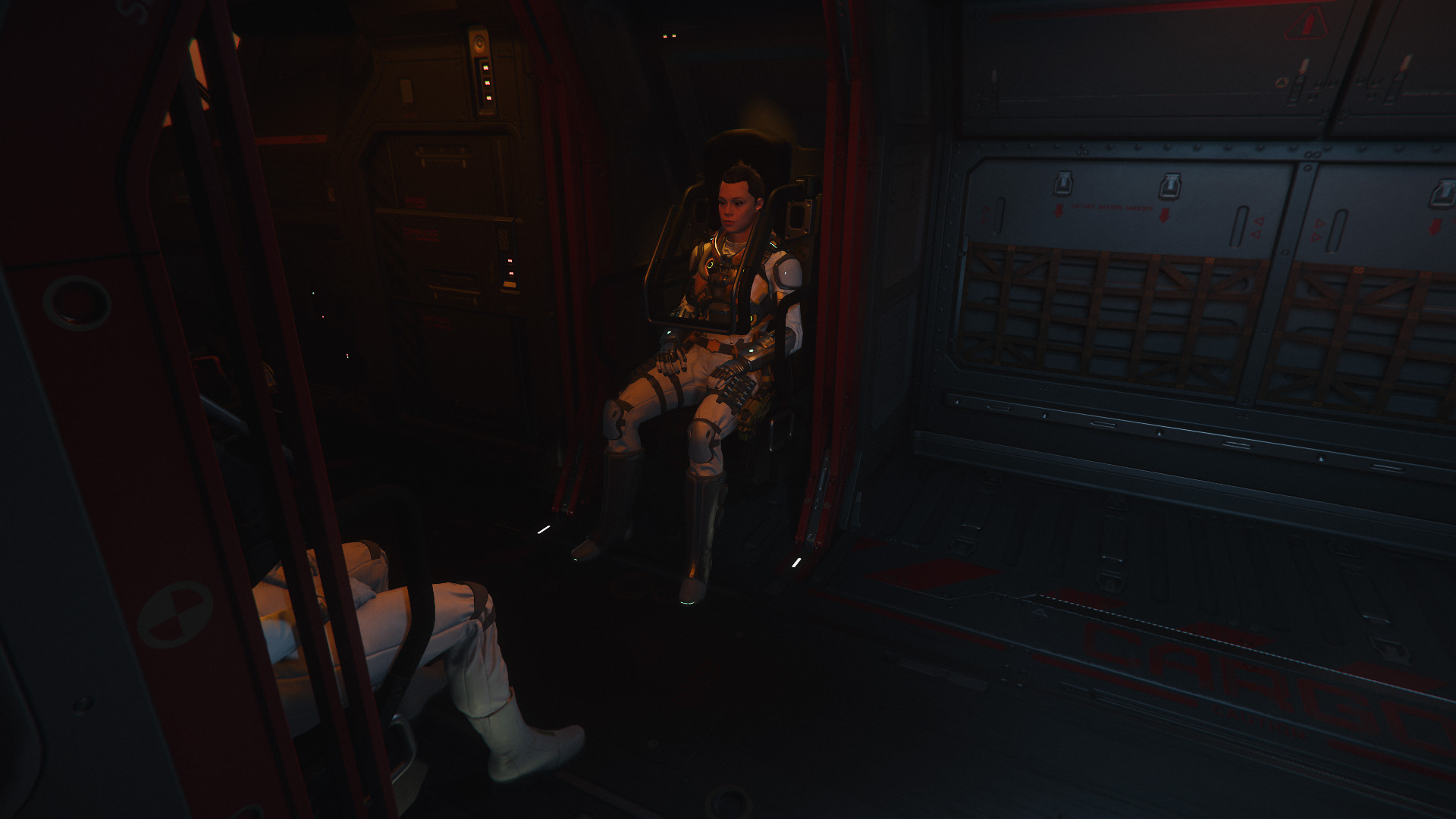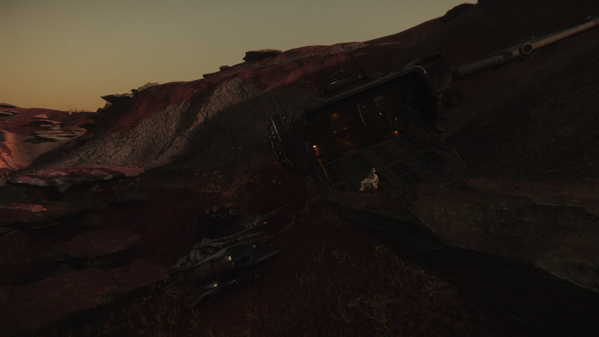 The ramp was still open from Lily’s exit. Her Fury was parked just past the ramp. She was sitting on a rock nearby, looking out over the red Hurston desert. The Corsair’s port wings were lying some distance away from the rest of the wreck.